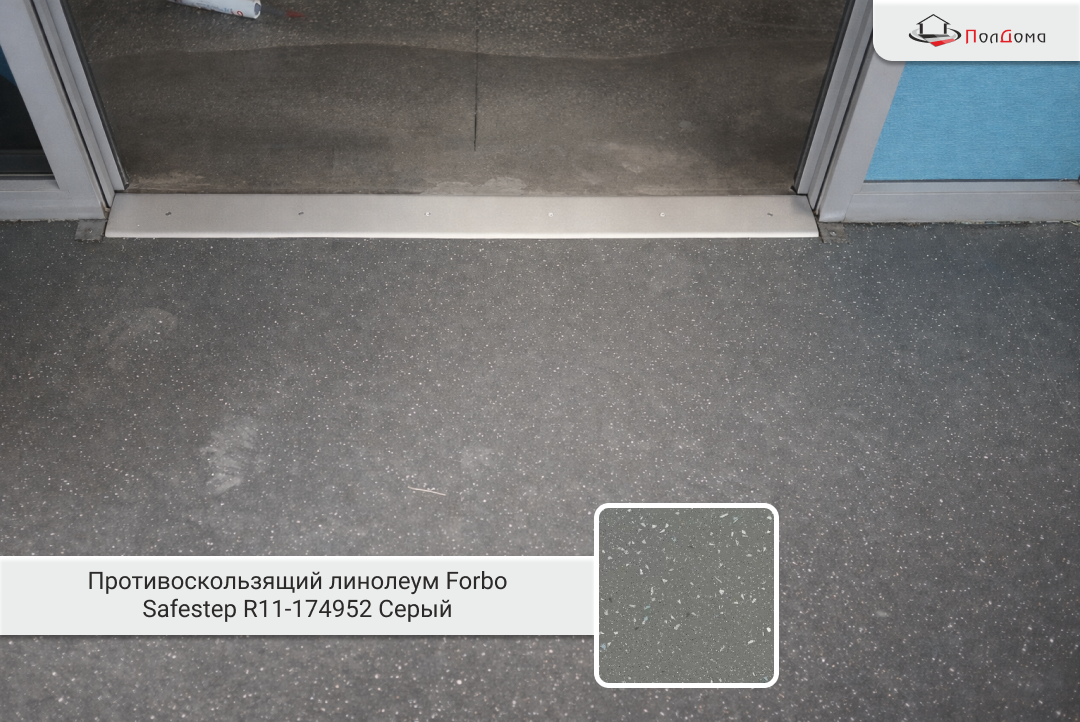 Safestep R11 — это покрытие, которое выбирают не «за красоту на витрине», а за реальные свойства в работе. Оно создано для зон, где важно уверенное сцепление с обувью и высокий уровень гигиены. По фото видно характерную фактуру — спокойный серый фон с контрастными вкраплениями: практично, немарко и отлично подходит для технических и общественных пространств.